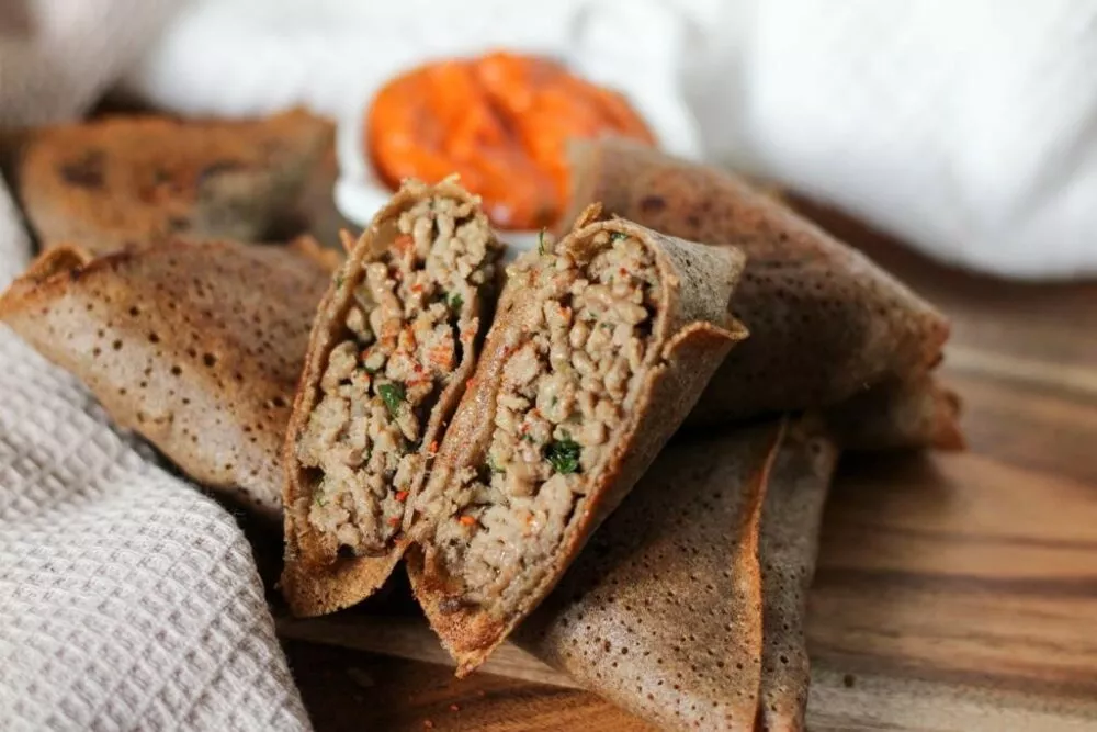 - Lustrer de beurre fondu une bande de galette au pinceau, déposer de la farce et procéder au roulage samoussa.